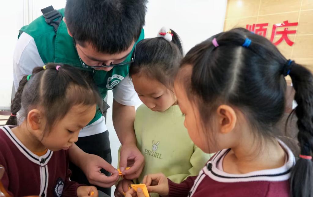 图为志愿者和小朋友一起做手工