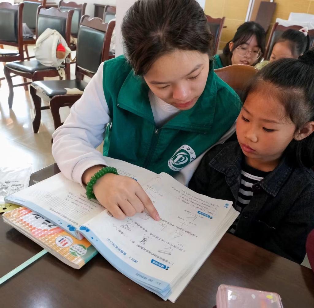 图为志愿者辅导小朋友做作业