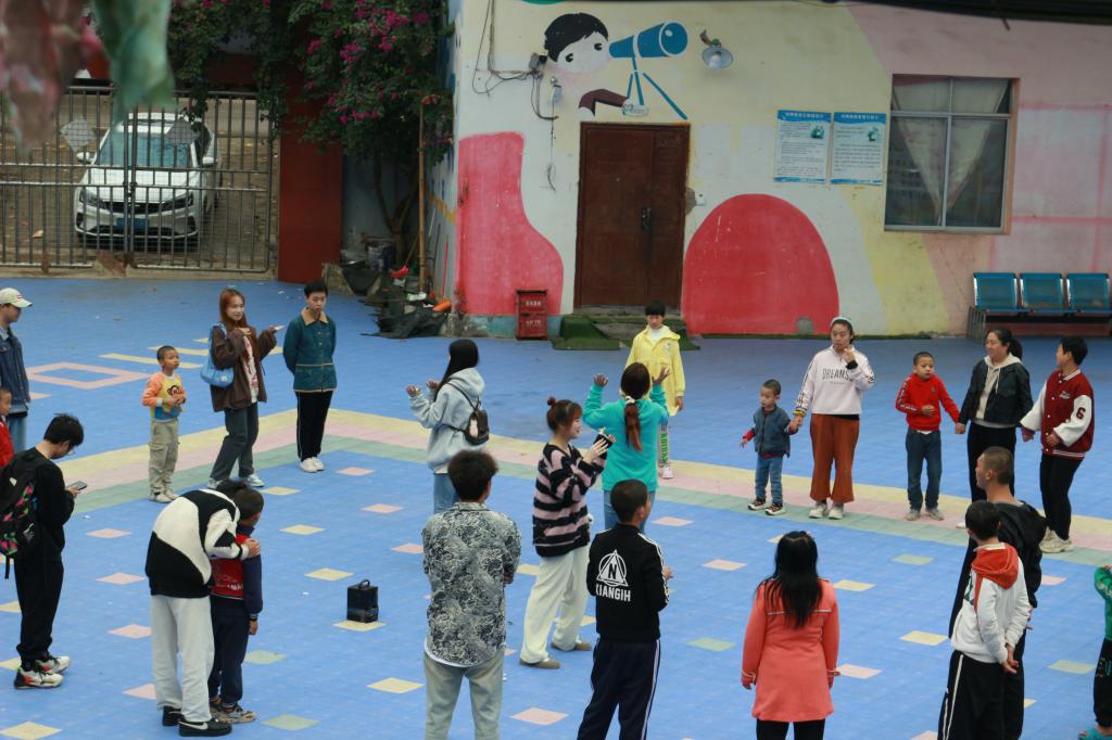 图为志愿者和小朋友们玩游戏