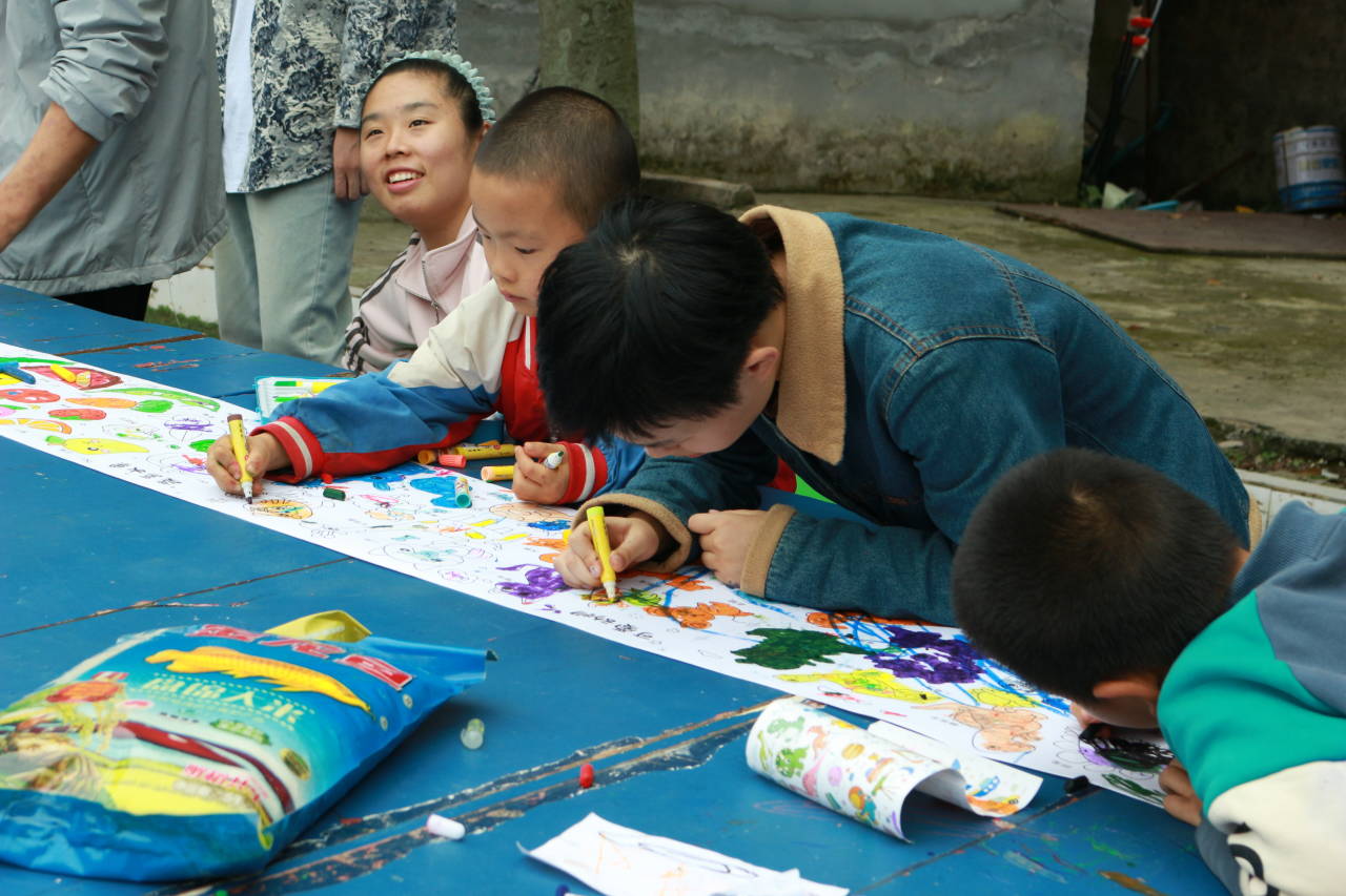 图为志愿者和小朋友们绘画