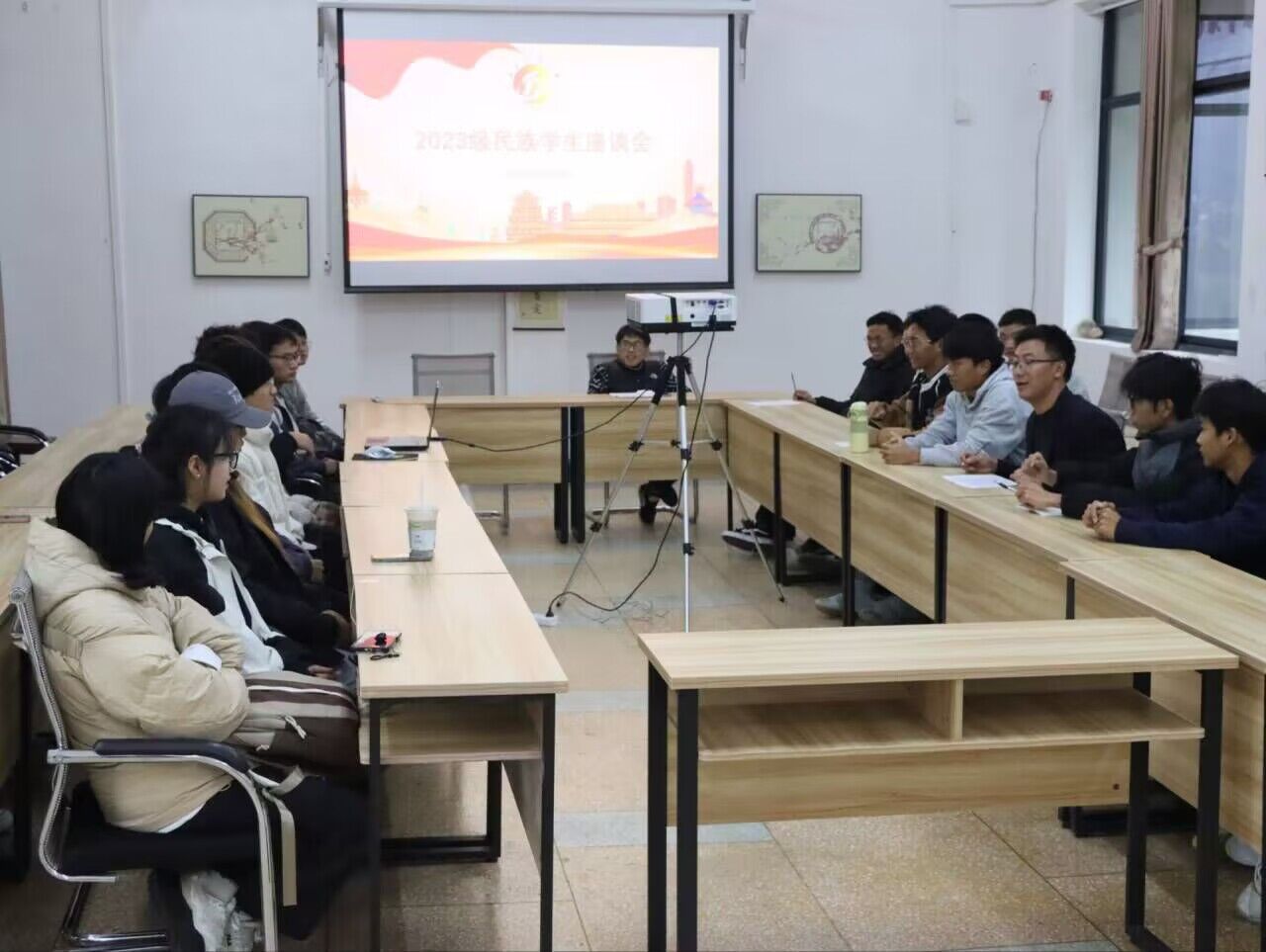 为全面了解2023级民族学生的学习和生活情况,帮助他们更好地完成学业。11月29日下午,学生发展部(团委)在外语村举办了2023级民族学生座谈会,学生发展部(团委)副部长秦明旺主持会议,部分2023级学生代表参加了本次座谈会。