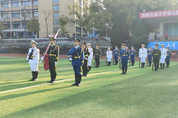 为弘扬爱国主义精神,落实爱国主义教育,11月26日上午,南充校区国旗护卫队于足球场,为西南石油大学幼儿园开展的“温馨亲子情,畅游军旅梦”亲子军营体验活动举行升旗仪式。