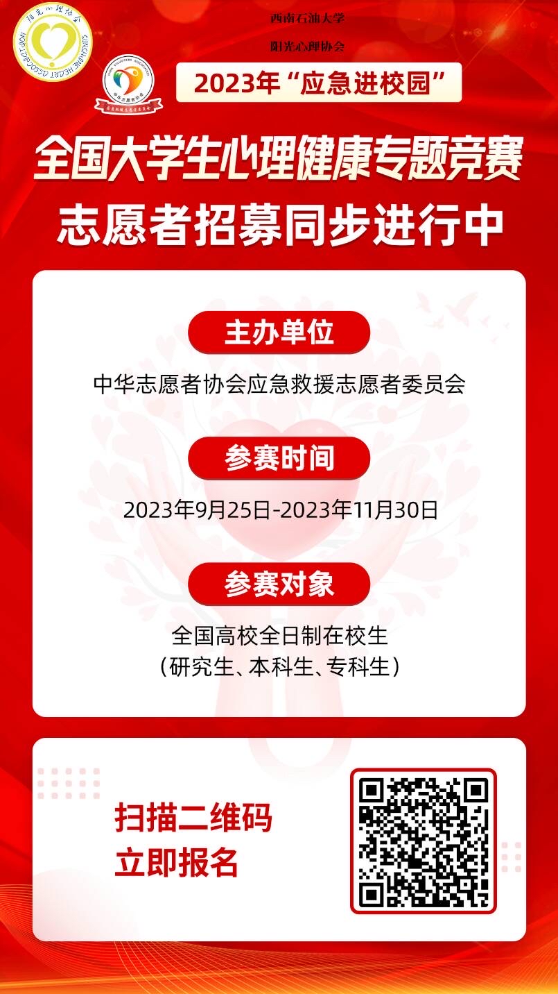 10月16日至11月29日,校区学生社团联合会阳光心理协会举办了以“应急进校园”为主题的大学生心理健康知识竞赛。本次活动共计776人参与。