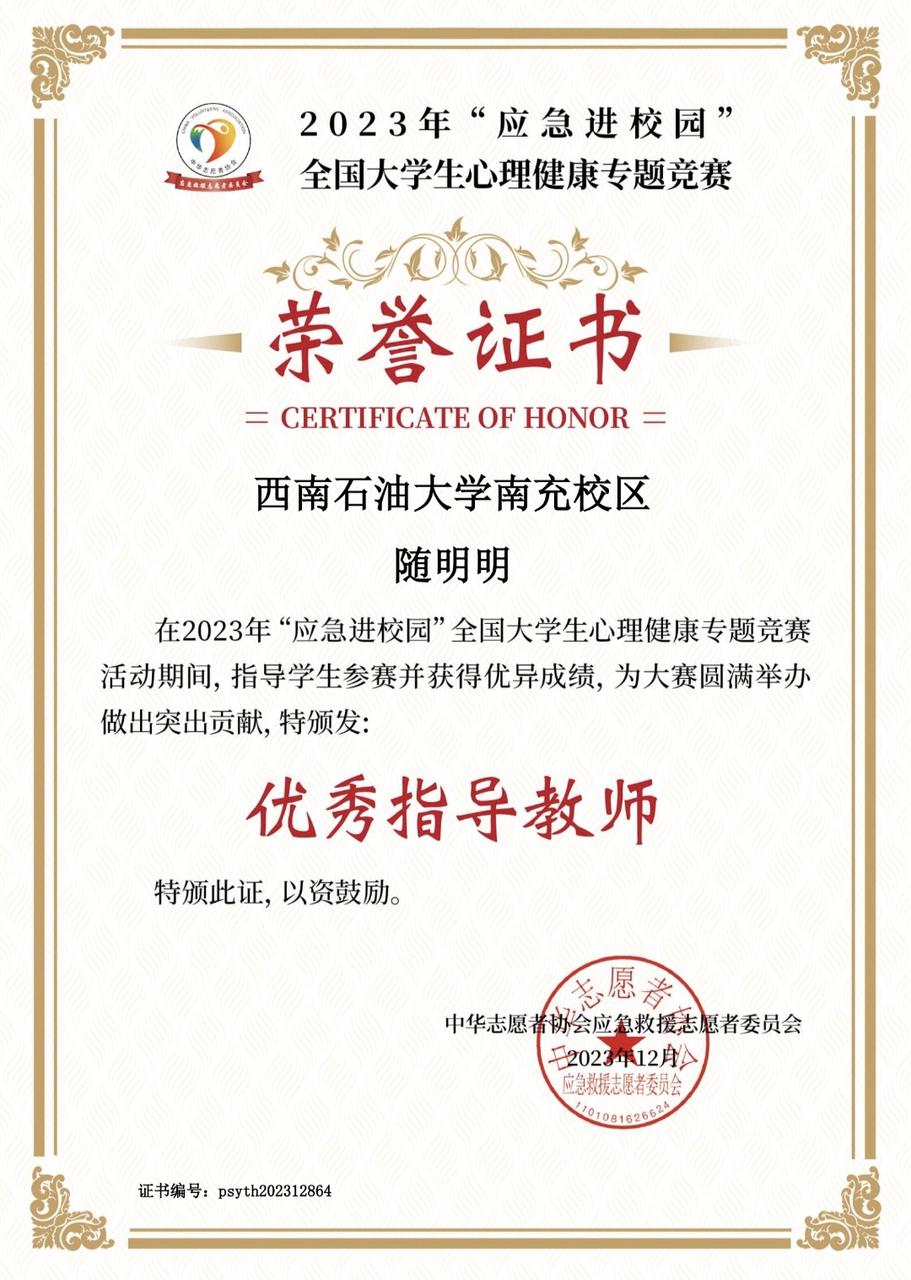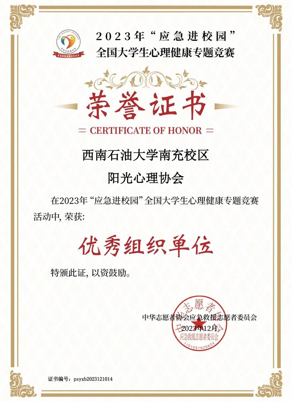 近日,由中华志愿者协会应急救援志愿者委员会主办的“2023‘应急进校园’全国大学生心理健康专题竞赛活动”圆满落下帷幕。校区社团联阳光心理协会荣获“优秀组织单位奖”,指导老师随明明荣获“优秀指导教师”称号。