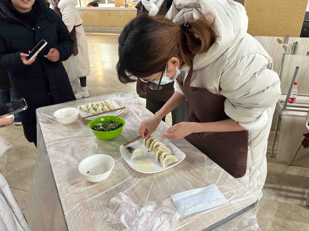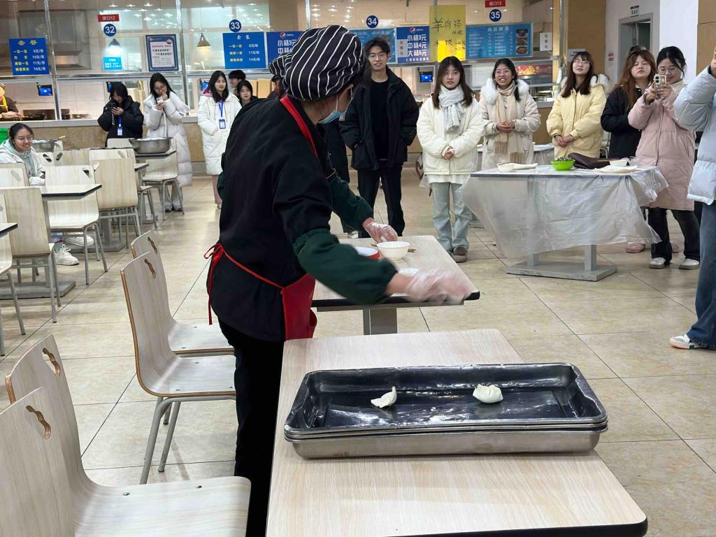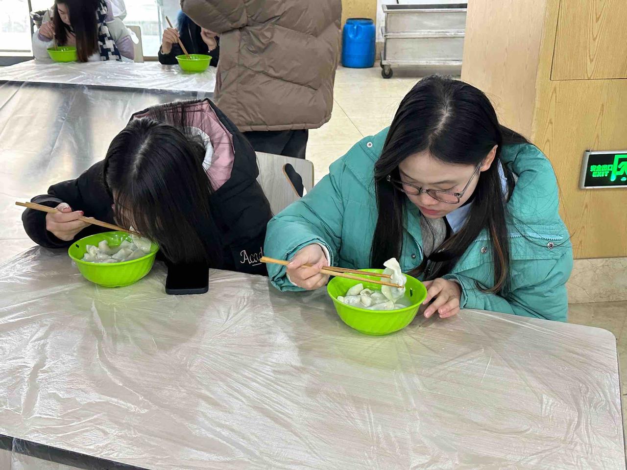 活动开始前,工作人员对活动场地进行布置并准备好相关食材。活动赛程分为普通包饺子,创意包饺子和吃饺子三个环节。其中,普通包饺子比赛由食堂阿姨现场教学,同学们两人一组,通过比较包10个饺子所用时间决出用时最短者。创意包饺子组鼓励同学们创新饺子包法,最后通过线上投票,选出最受欢迎的包法。吃饺子组则记录同学们吃12个饺子的时长,用时短者获胜。活动期间,大家热情洋溢,将浓浓的冬至情融入进每一个饺子的制作过程中。最后,食堂的叔叔阿姨和同学们坐在一起品尝自己亲手包的热腾腾的饺子,共享着独属于冬至日的温暖和爱意。