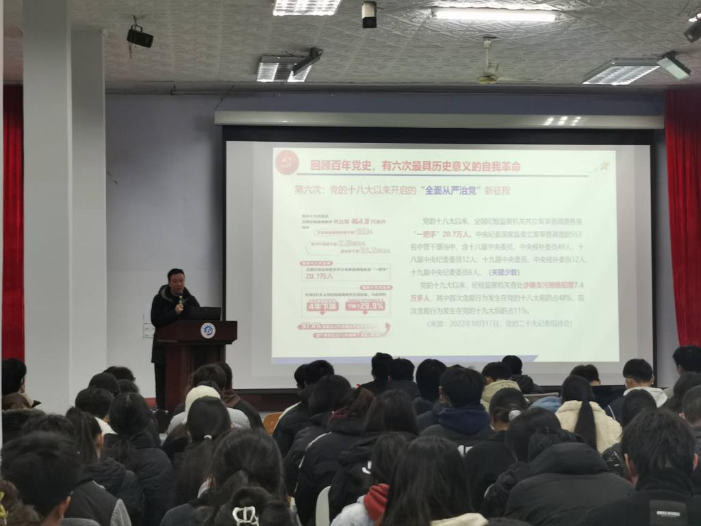 会上,范起东老师以党的二十大内容、精神为切入点,深入细致地向同学们讲解了中国共产党自成立以来的六次自我革命。结合历史事实与自身经历,他提出党始终以自我革命引领社会革命、始终坚持全面从严治党、大力推进反腐败斗争的深刻内涵和重要意义,并强调党的自我净化、自我完善,自我革命、自我提升给中国共产党带来的深远影响。最后范起东老师勉励全体学员,提出爱国、励志、求真、力行、廉洁的建议,希望全体青马学员提升思想觉悟,矢志不渝艰苦奋斗,时刻牢记初心使命,为今后的拼搏奋进注入新的精神动力。