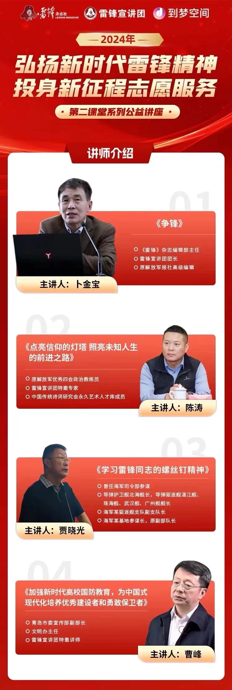 本次讲座期间,解放军报社原高级编辑、《雷锋》杂志编辑部主任、雷锋宣讲团团长——卜金宝以《争锋》为题,从”雷锋的故事“”精神解读“”志愿“等角度切入,带同学们回顾了一段段感人的故事,教导同学们要学习雷锋精神,做一颗永不生锈的螺丝钉。
