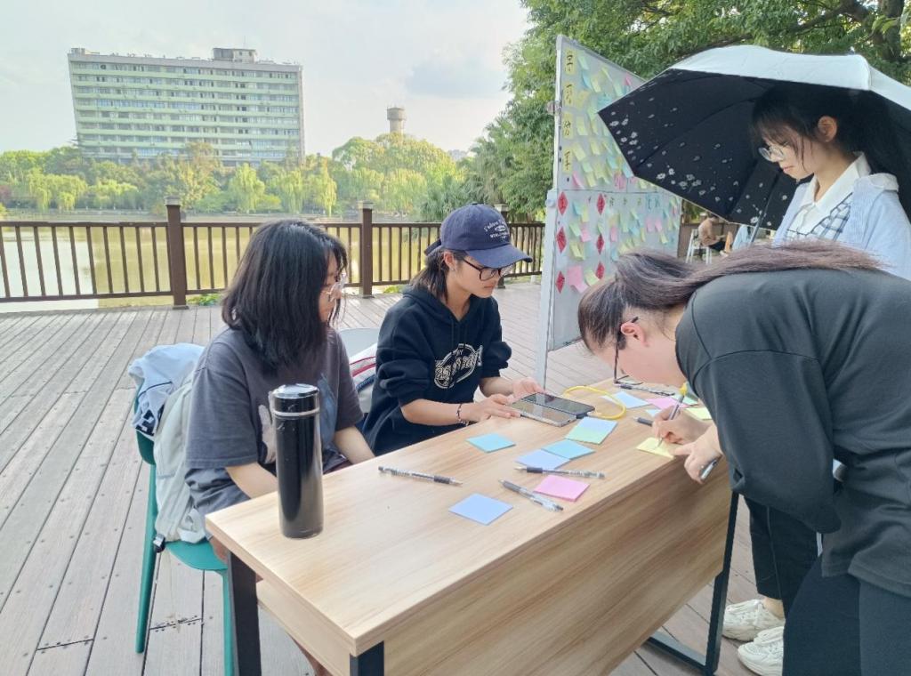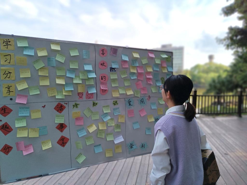 活动中,同学们在龙井湖观景台现场领取便利贴,并写下自己的分享;同时通过阅读其他人所分享的内容了解到新的知识,以交叉式的途径完善自己的知识储备。