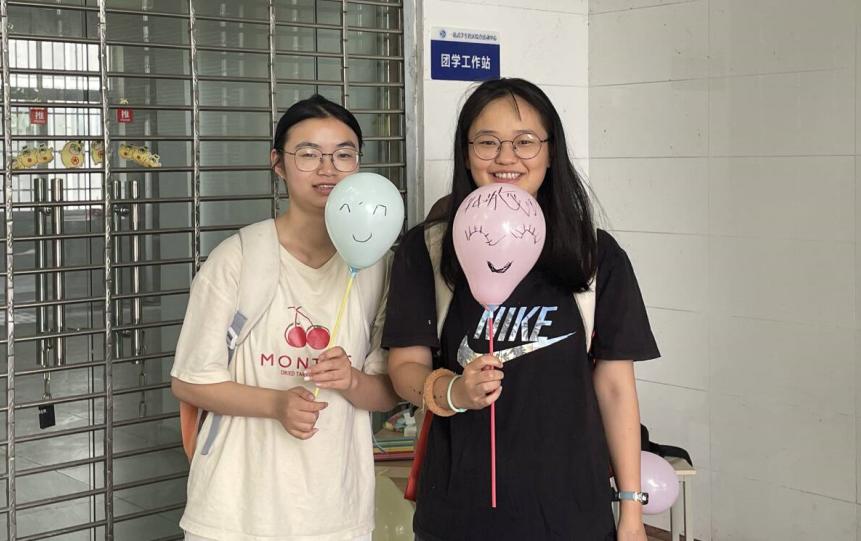 同学与自己画的气球合影
