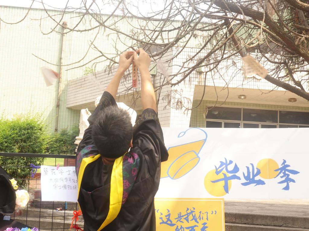 本次活动以游戏的形式进行,设置了学士帽DIY簪花、交换祝福、纸飞机许愿、以物换花四个环节。学校内放置了三个不同的特色展板,供毕业生们打卡拍照,大家积极参与,在照片中定格自己的青春印记。趣味活动的开展,让毕业生们在游戏中留下自己的珍贵回忆。树上悬挂的期盼,气球里埋藏的祝福,都饱含着学院对毕业生的美好祝愿。大家沉浸于各个活动中,感受着毕业的快乐,现场充满欢声笑语,氛围和谐轻松。