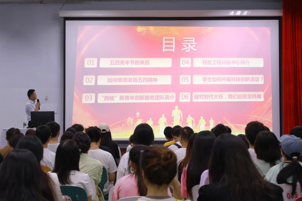 活动中师生集中观看第28届中国青年五四奖章宣传片《青春为中国式现代化挺膺担当》,潘波介绍了“西柚”新青年创新服务团队自成立以来,立足服务南充经济,推动创新动力发展,以培养学生创新精神和工程能力为目标,扎实教学、潜心科研、培育特色,主动发挥高校社会服务职能等工作。吴澜婧鼓励学子们主动向榜样看齐,向优秀靠近,在新时代新征程中勇当排头兵和生力军,不断书写为中国式现代化挺膺担当的青春篇章。