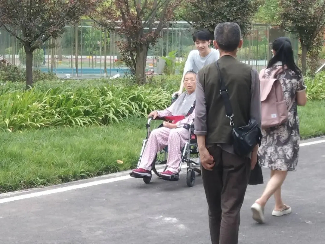 图为实践队员为老人推轮椅
