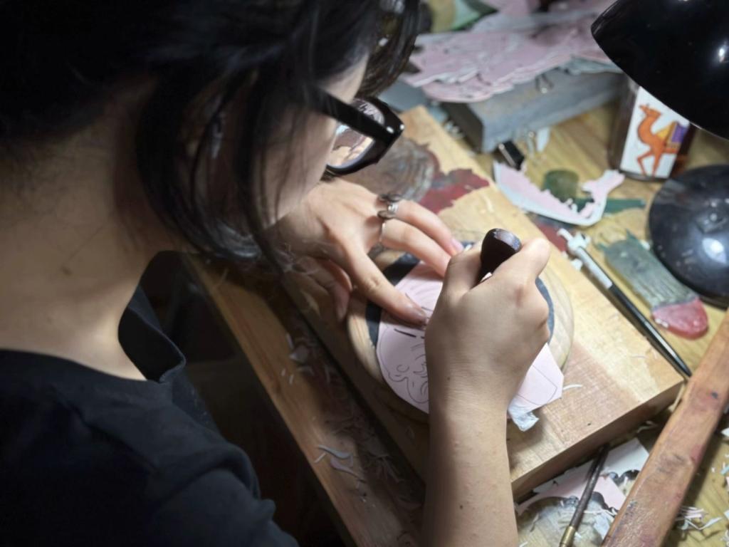图为工作人员雕刻皮影纸