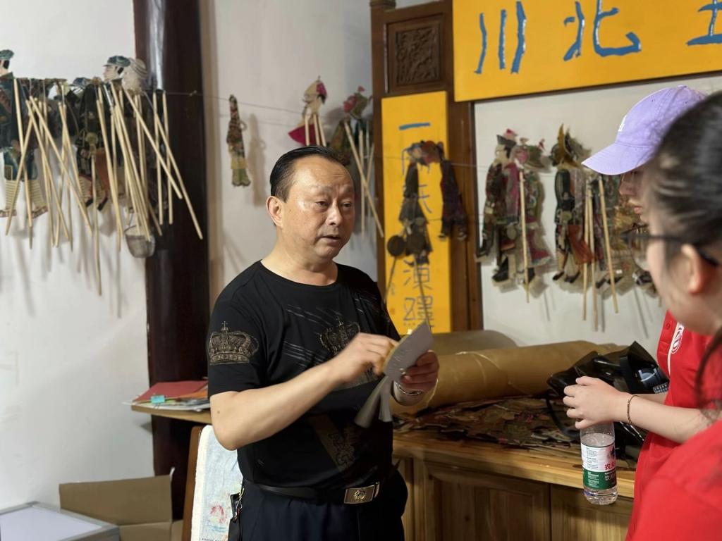 首先是参观幕后工作室,队员们借此机会了解皮影的制作材料以及工艺流程。接着,队员们观察皮影纸稿雕刻设计,然后亲自尝试固定纸稿,体会到步骤的不易。随后,团队成员们有幸对王彪进行了一次采访。王彪老师是国家级非遗皮影戏传承人,阆中“王皮影”第七代传人,致力于皮影艺术的传承与发展。王老师表达了自己对皮影戏的热爱和执着,讲述了他多年来在皮影表演领域的探索和成就。在采访中,王彪老师谈到了皮影戏的传统与现代融合,以及传承与创新的重要性。