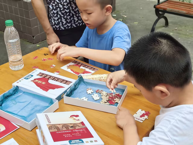 图为社区小朋友玩西柏坡拼图