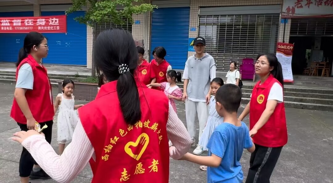 图为志愿者带领小朋友玩游戏