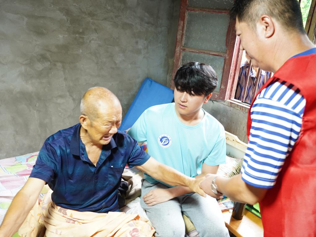 图为志愿者扶退伍老兵起床