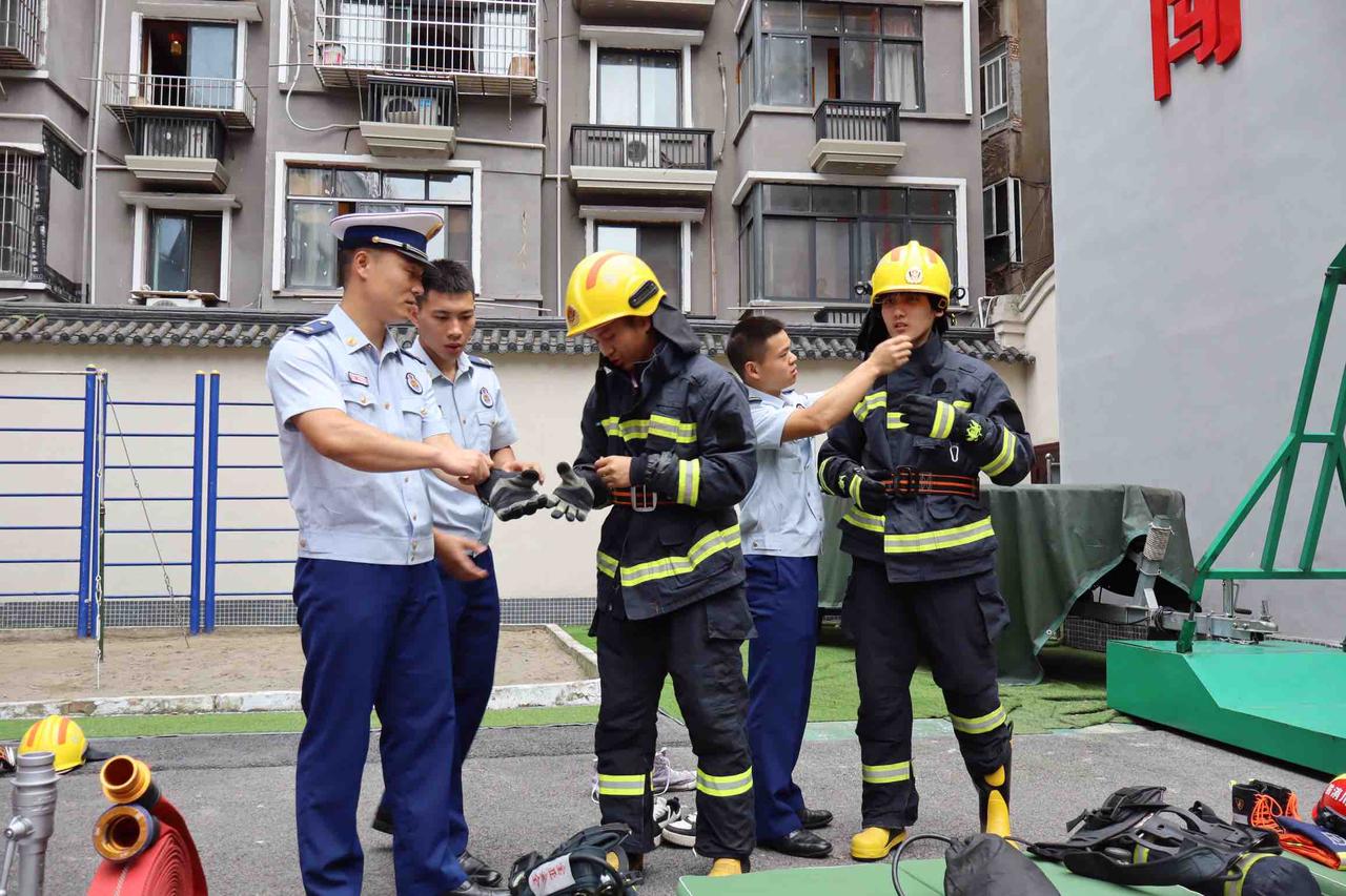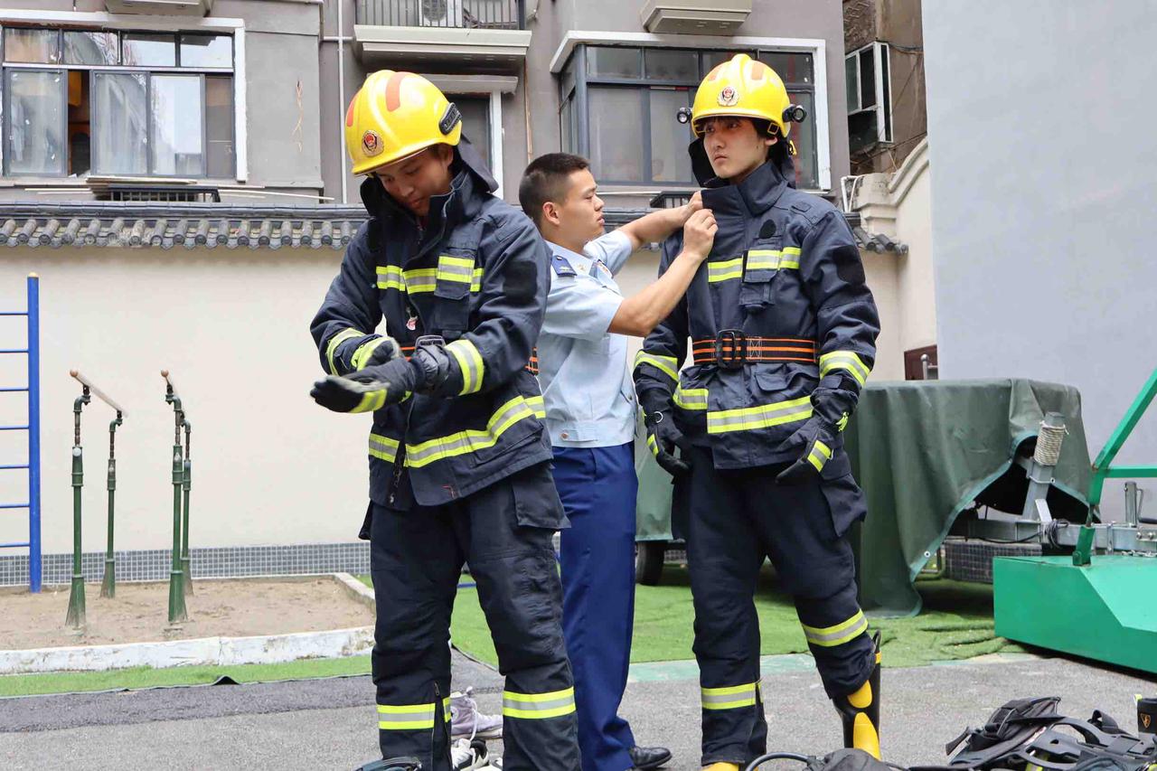 图为消防员帮助队员穿消防服