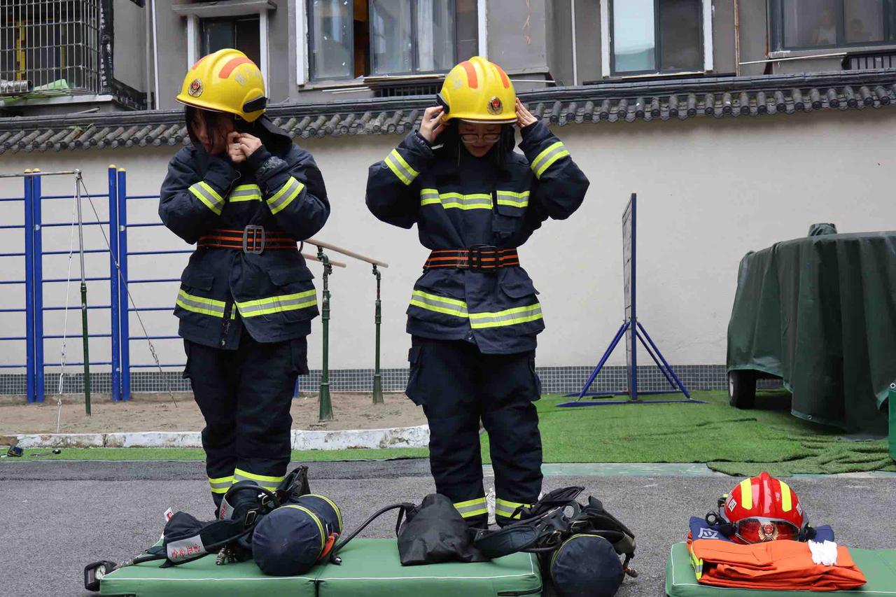 图为队员体验消防服