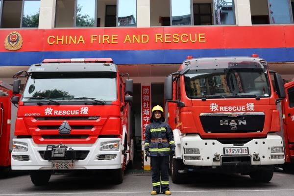图为队员与消防车合影1