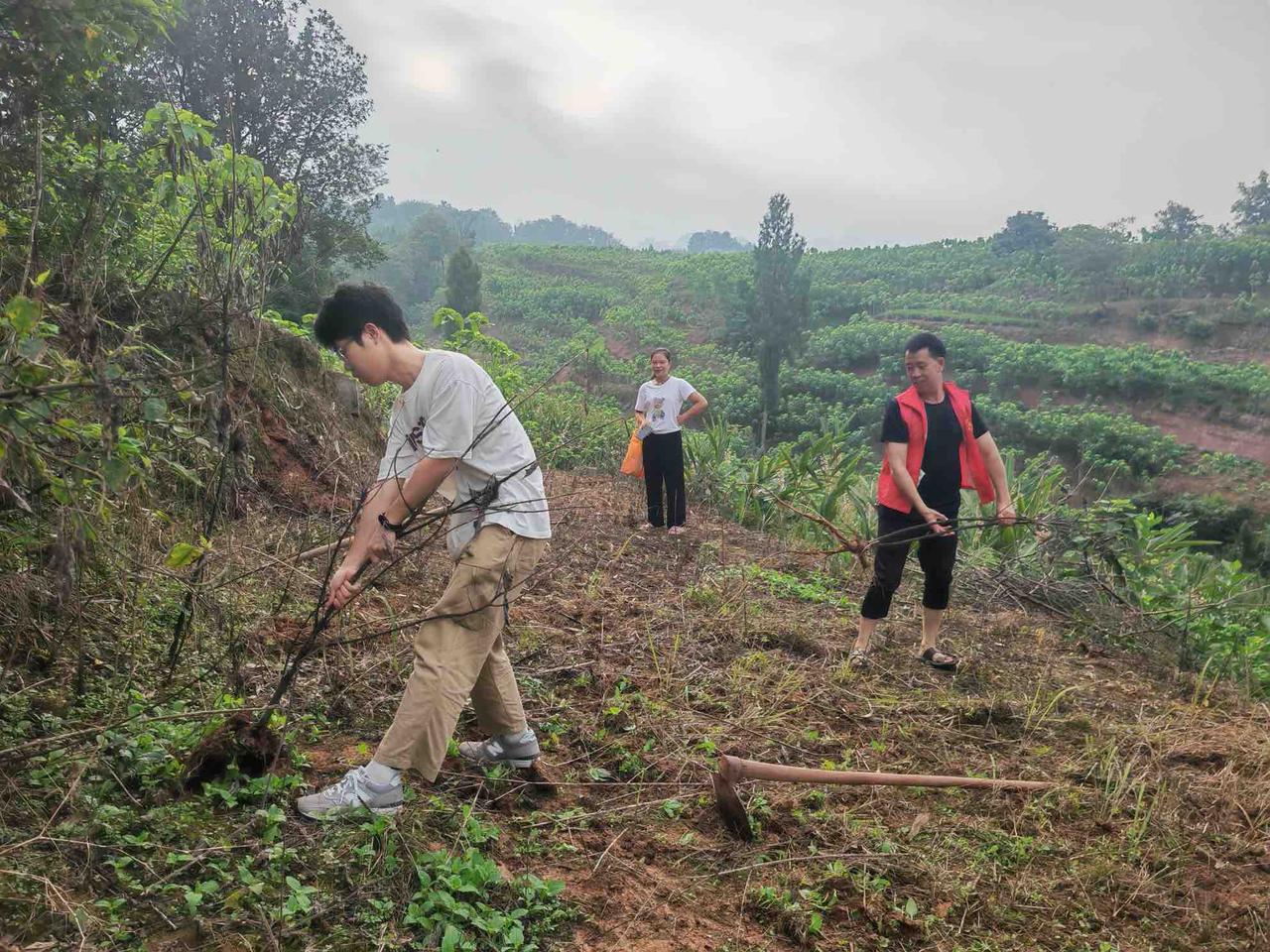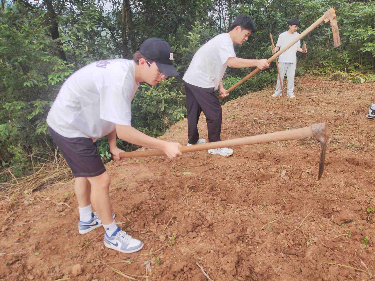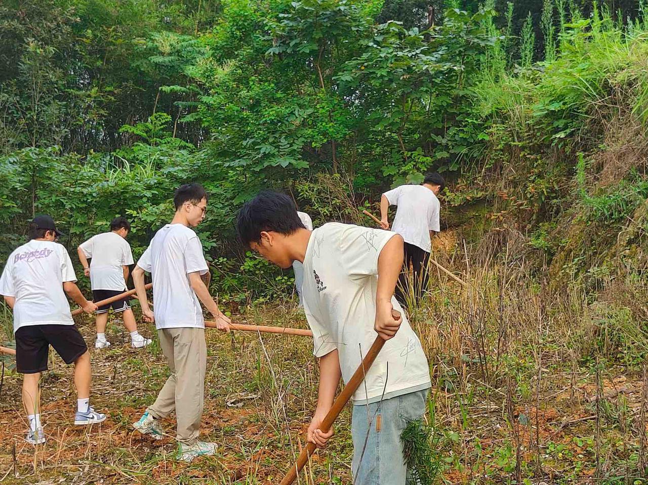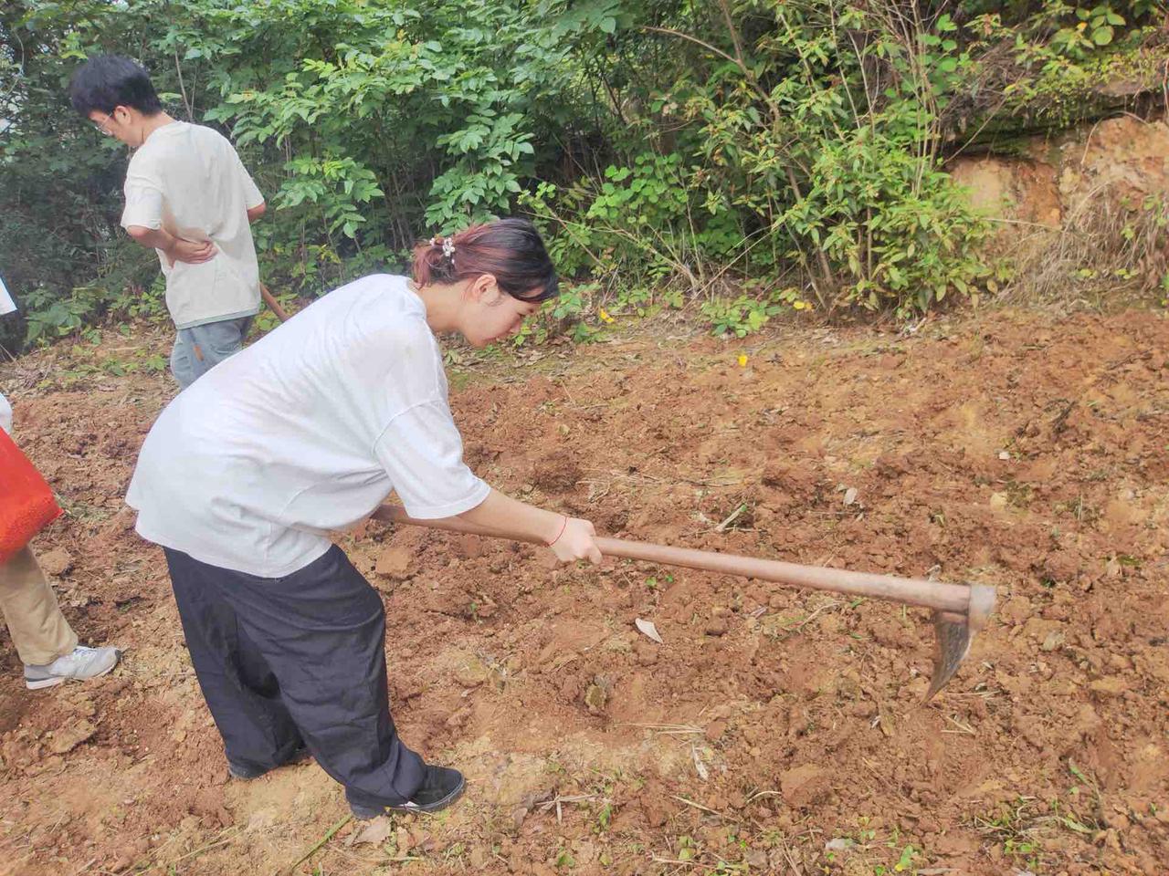 实践队员们在村书记的带领下手拿工具,顶着炽热的阳光,弯腰劳作,为种植桑树做准备。
