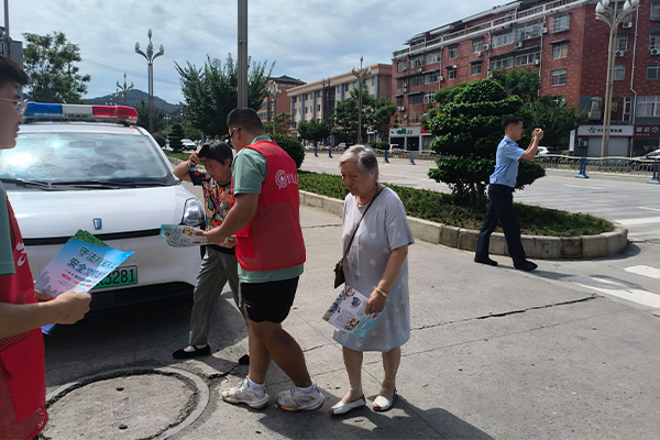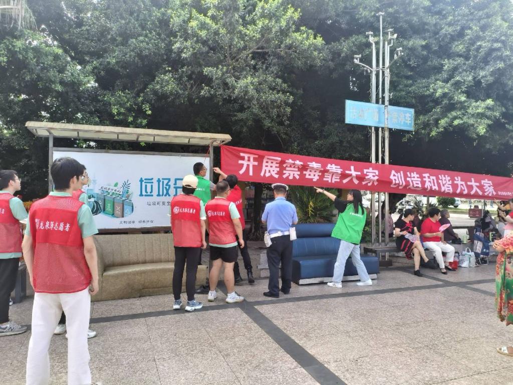上午十时,队员们来到社区广场上分为两队。一队在工作人员的安排下拉起横幅,进行禁毒宣传的活动。队员们分发禁毒宣传单,为居民讲解禁毒知识,倡导居民积极参与到禁毒活动中去。另一队来到人行道旁分发交通安全宣传单、提醒骑乘电瓶车的居民佩戴好头盔、搀扶老人过马路。