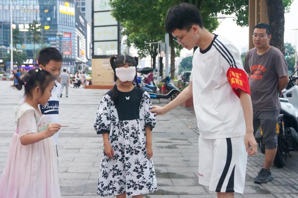 图为志愿者为参与者发放奖品
