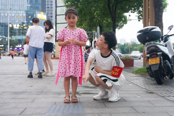 图为志愿者为参与者讲解盲道小知识