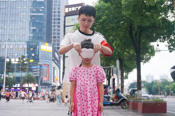 图为志愿者为参与者佩戴眼罩