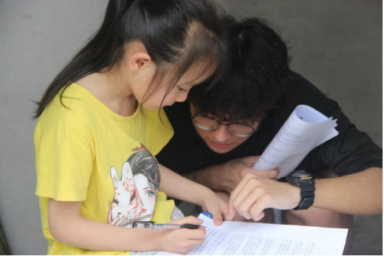 图为实践队员指导小朋友完成居民生态意识保护调查问卷