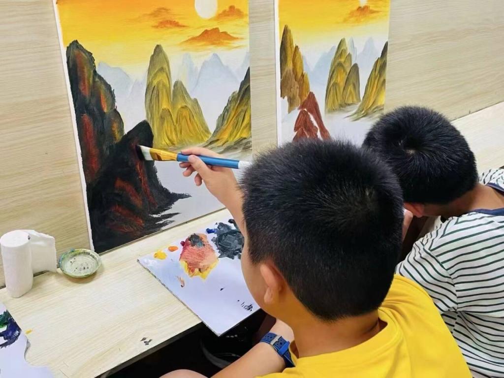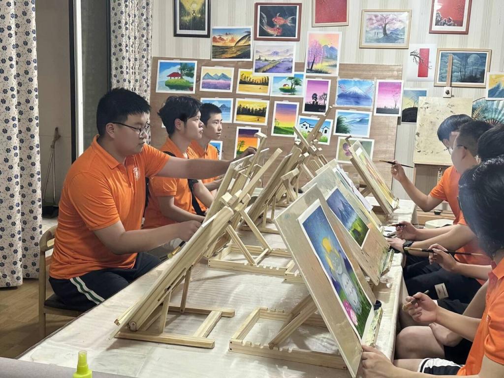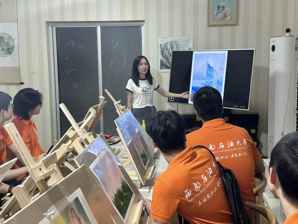 活动伊始,刀画艺术工作室的胥奕馨老师进行自我介绍,讲述了她近十年从事刀画非遗项目的工作经历并表达了对这项事业的热爱。随后,胥老师带领实践队成员了解非物质文化遗产的概念、分类及其在现代社会中的价值,并详细讲解刀画的发展历史。在培训过程中,胥老师采用寓教于乐的方式,耐心示范如何使用画笔,如何调配颜色,并邀请实践团队成员上台进行教学体验。团队成员依次上台,为来画室体验的小朋友讲解绘画步骤。胥老师旁听后表示实践团队充分完成了教学准备工作,对大家的教学能力给予了充分肯定。