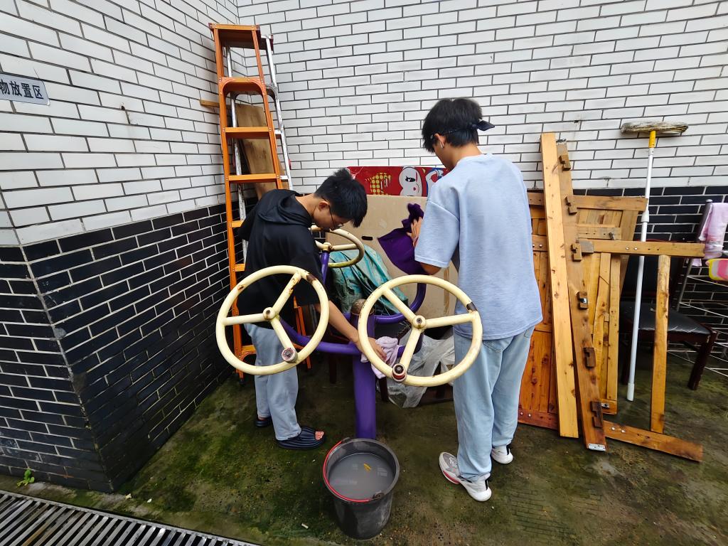 图为志愿者擦拭运动物品