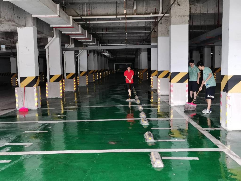 图为志愿者清理地下车库