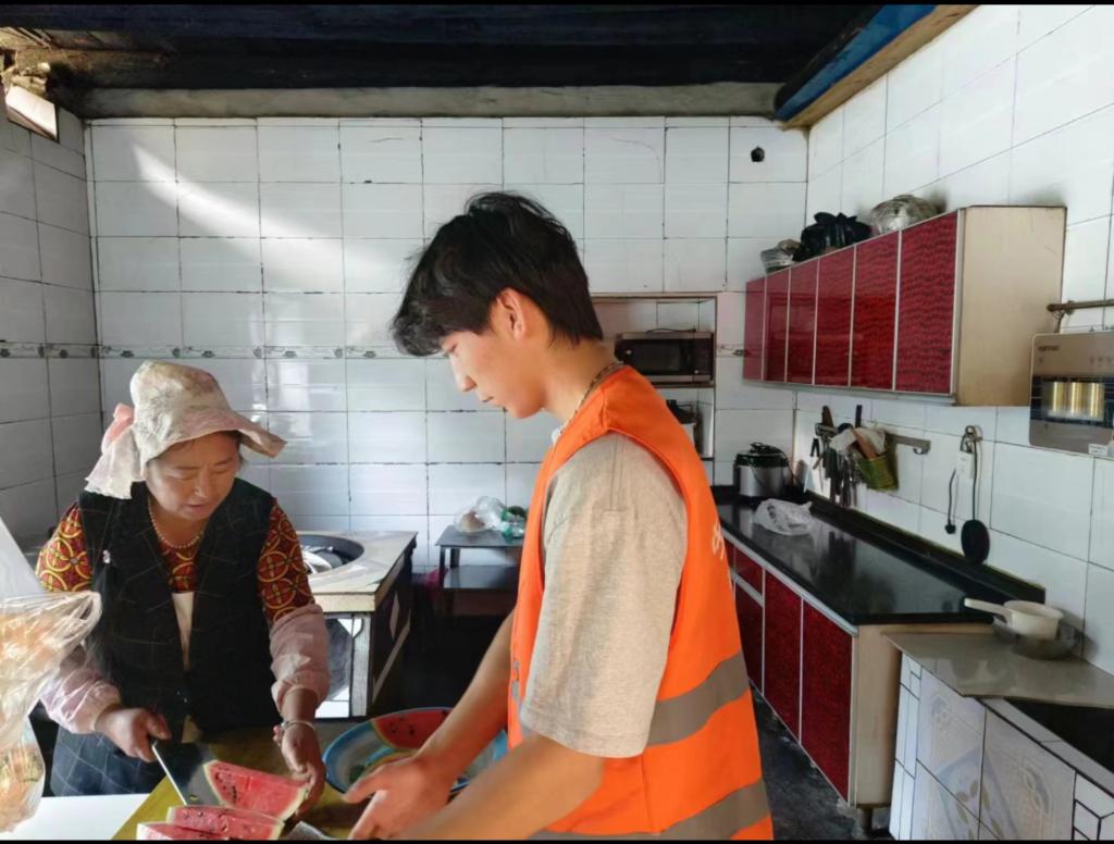 先遣队队员前往小金县几户村民家中进行走访调研,询问了村民的经济条件、住房条件和吃穿条件等问题,期间队员耐心询问,村民热心回答,并向队员端来水果,队员也为村民清洗碗具。