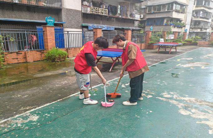 图为志愿者们对社区进行环境维护