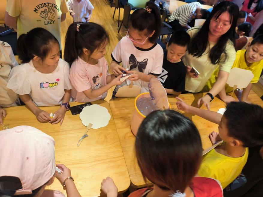 图为志愿者们为小朋友24节气非遗文化中关于漆扇的制作