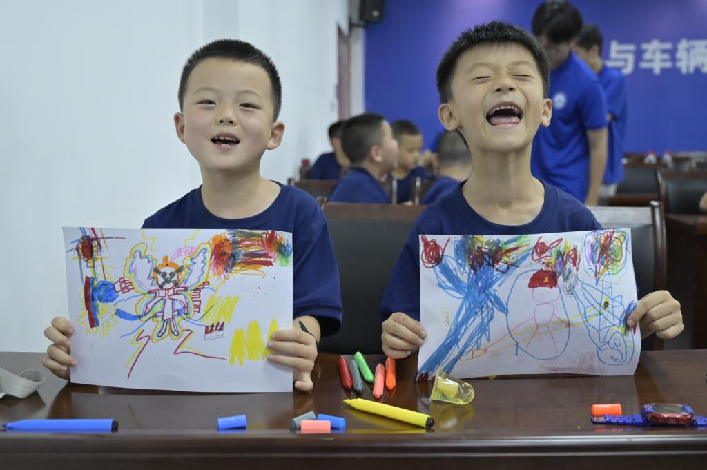 图为小朋友展示自己的画作