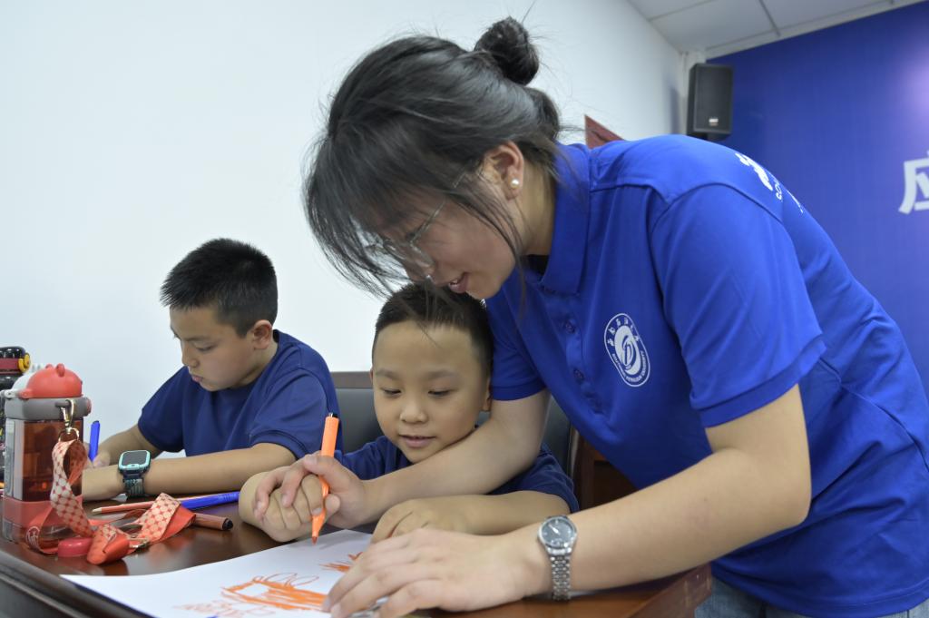 图为实践队员和小朋友一起画“我心中的英雄”