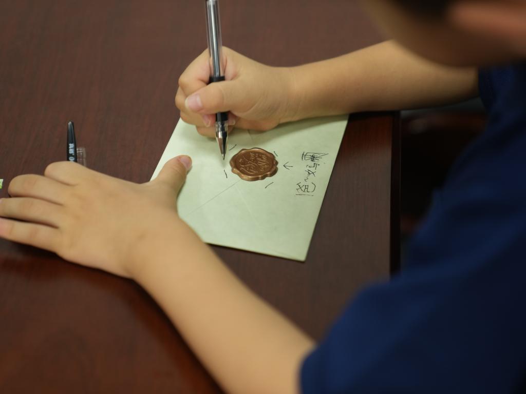 一个个信封被小朋友们轻轻用火漆蜡封上,它们将随着关怀给工作的父母送去慰藉,小朋友们落笔之处,满是深情。