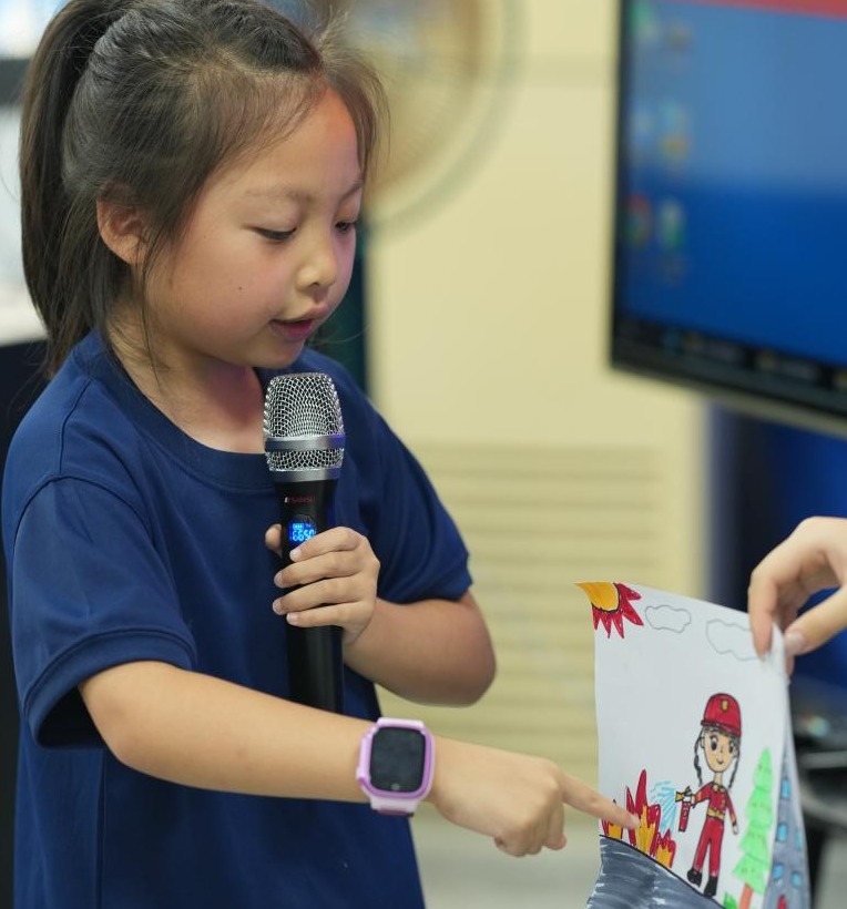 图为小朋友正在介绍自己的画作