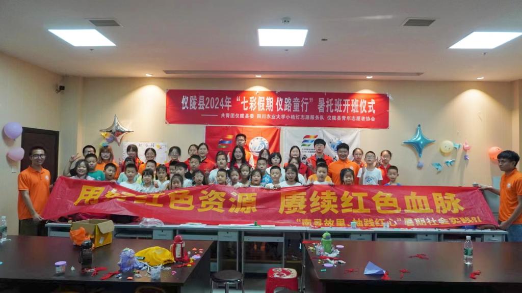 图为实践队与仪陇县“七彩假期 仪路童行”暑托班合影