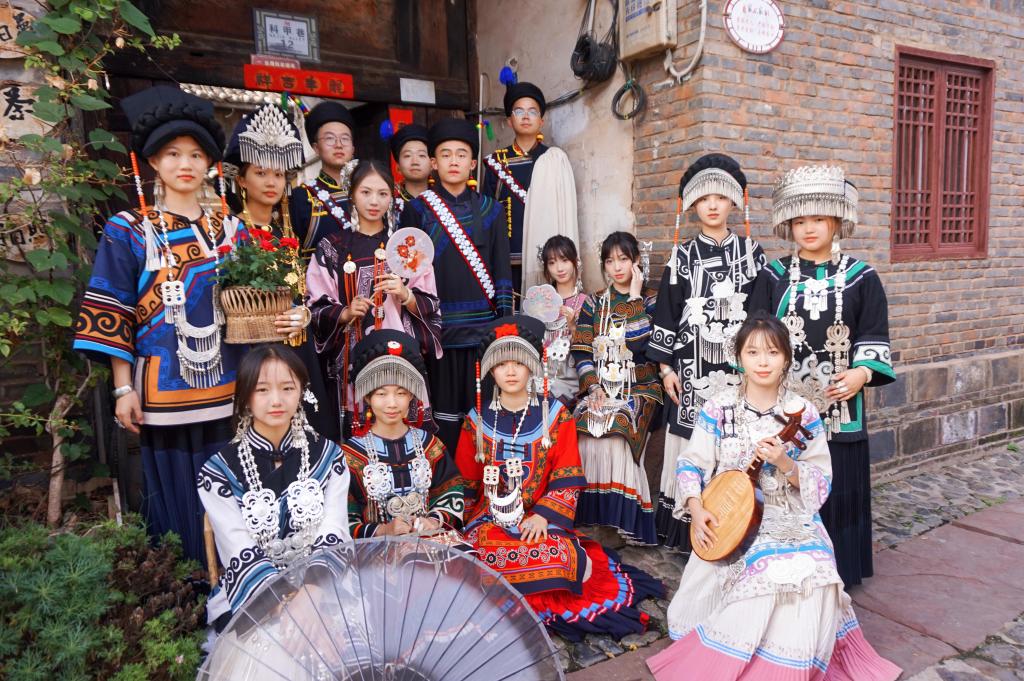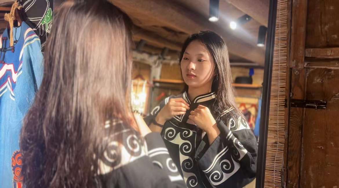 实践队从古城民俗体验店里租借了具有民族特色的彝族服饰,店主向队员讲述自己开体验店的初衷,并介绍彝族服饰的制作工艺。队员们了解到,传统的彝族服饰通常以红黄黑三个颜色为主,经过现代的改变融合,加入了更多的颜色,将传统彝族服装与多民族审美不断融合改良,形成了既具观赏性又具有彝族特色的独特服饰。实践队队员杨欣雨身着彝族服饰不禁感慨道:“穿在身上的历史,打开尘封的记忆,彝族服饰是彝族文化中的耀眼明珠,是物质化的精神产品,是活态的文化。”