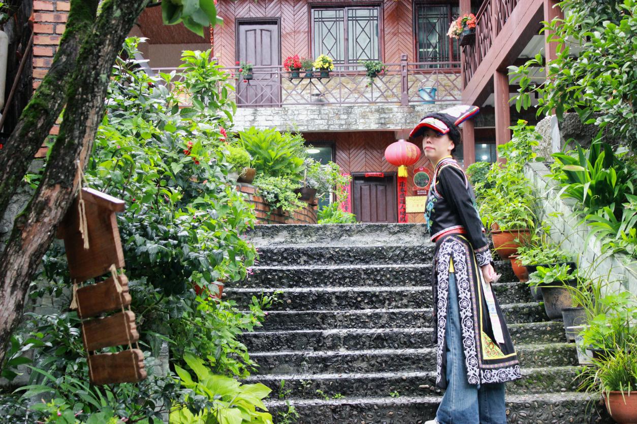 细雨纷飞,云雾朦胧,当天,实践队员们前往石椅羌寨体验羌族民族服饰,并参观“云朵上的民族”景区,深入体验了羌族特色文化。羌族服饰以其独特的风格和丰富的文化内涵,成为中华民族服饰宝库中的瑰宝。在店主的引导下,实践队员们试穿羌族的传统服饰,亲身感受羌族服饰的精美工艺和独特魅力。在羌寨景区参观的过程中,队员们认识到羌族服饰的图案、色彩和制作工艺,蕴含着羌族人民对自然、生活和信仰的独特理解,是羌族文化的重要组成部分。实践队员们了解到羊图腾文化是羌族主要文化符号之一,羊对羌族人的重要意义可见一斑。