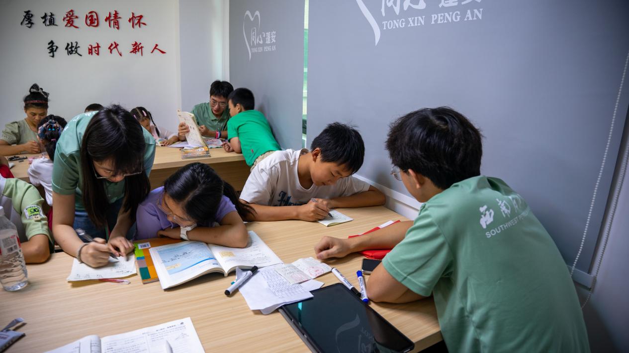 图为实践队员为学生辅导作业