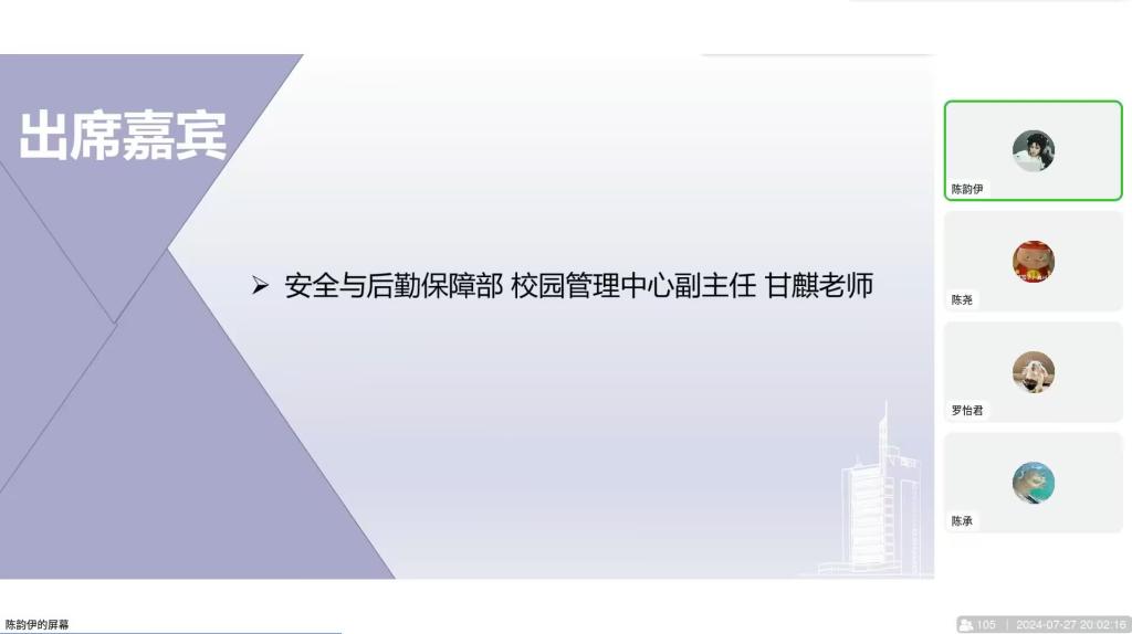 校区社团联合会生命绿舟协会指导老师、校区安全与后勤保障部校园管理中心副主任甘麒和全体志愿者线上参会,会议由校区社团联合会副主席陈韵伊主持。