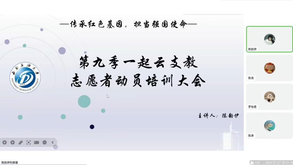 随着此次暑假云支教培训动员大会的圆满落幕,标志西南石油大学南充校区暑假云支教活动的正式启动。薪火相传担使命。第九季“云支教”将引导大学生和中小学生传承红色基因,一起携手共进,用青春之火点亮希望之光,共筑教育未来!