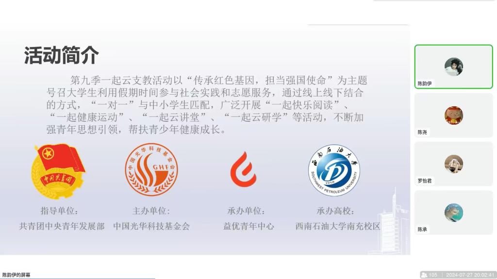会议内容还对云支教活动主题、志愿者管理机制、云活动执行内容、后续的奖励机制四大板块进行了具体介绍,并围绕活动开展的相关事项进行答疑。