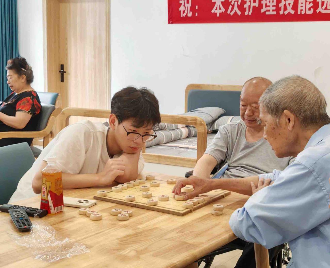 与此同时,在另一侧的活动区域,一场激烈的象棋比赛正在进行中。几位对棋艺颇有兴趣的老人与志愿者们围坐一桌,楚河汉界,兵来将挡,水来土掩,棋盘上你来我往,战况胶着。老人们凭借丰富的经验和深厚的功底,不时给志愿者们带来惊喜与挑战,而志愿者们也展现出了年轻人的机智与灵活,双方你来我往,乐在其中。