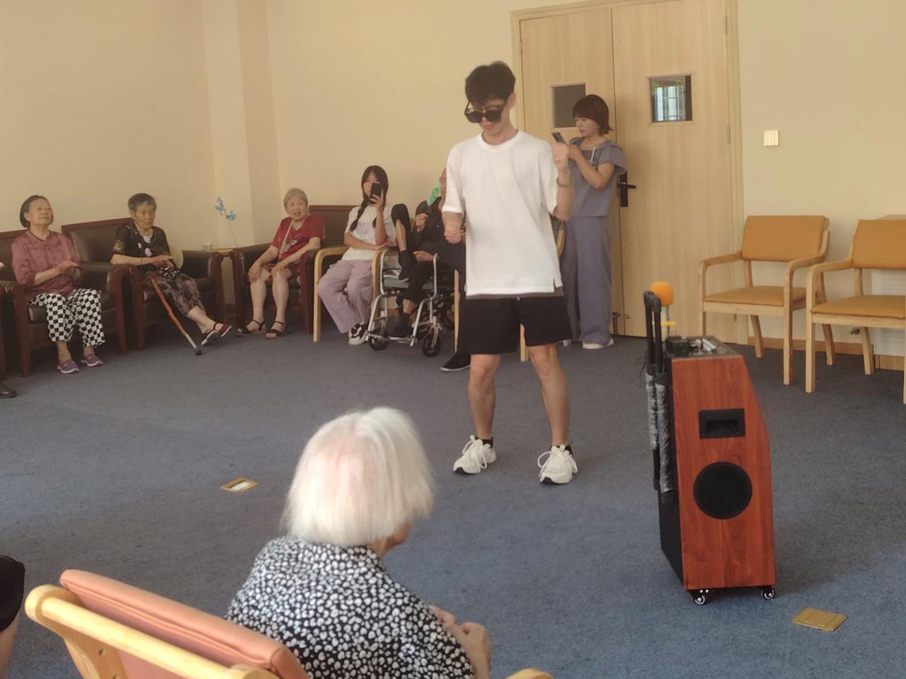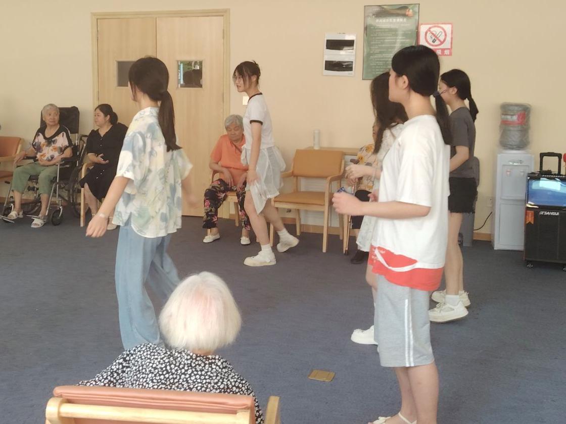 最令人期待的莫过于志愿者们为老人们准备的舞蹈表演了。随着音乐的响起,志愿者们以轻盈的步伐、优美的舞姿,为老人们献上了一场精彩的视觉盛宴。他们的表演不仅展现了大学生的青春活力与多才多艺,更让老人们感受到了年轻一代的热情与朝气。老人们纷纷鼓掌喝彩,脸上洋溢着幸福的笑容。此外,志愿者们手把手地教老人们学习简单的舞蹈动作。他们耐心地放慢节奏,一遍遍演示,确保每位老人都能跟上舞步。老人们学得认真,脸上挂着孩子般的笑容,仿佛回到了无忧无虑的年华。随着音乐缓缓响起,他们缓缓起舞,虽然动作略显生疏,但那份纯真与快乐却感染了每一位观众。