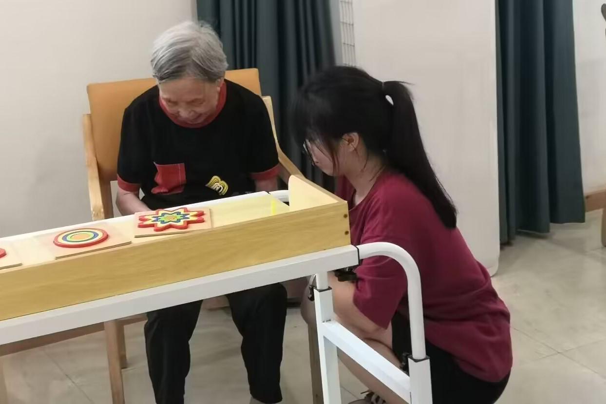 在康养中心活动室里,一场别开生面的交流活动温馨上演。来自筑梦团的数十名大学生志愿者,与养老院的老人们共同度过了一个充满乐趣与温情的下午,通过聊天、下象棋、做手工和表演舞蹈等多种形式,加深了彼此之间的情感联系,传递了社会的温暖与关怀。